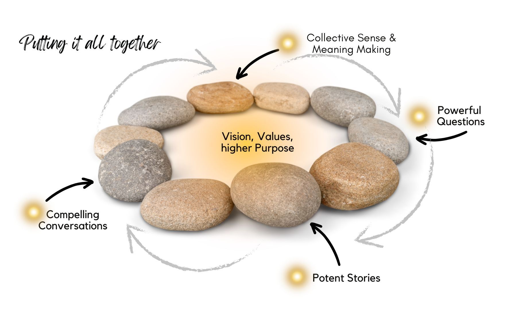 Powerful questions open the door to new perspectives and new possibilities. They trigger potent stories carrying the gold of lived experience. Stories in turn lead to compelling conversations. When you then work together to make collective sense and meaning, the whole system moves to higher ground. We get wiser and more capable together.